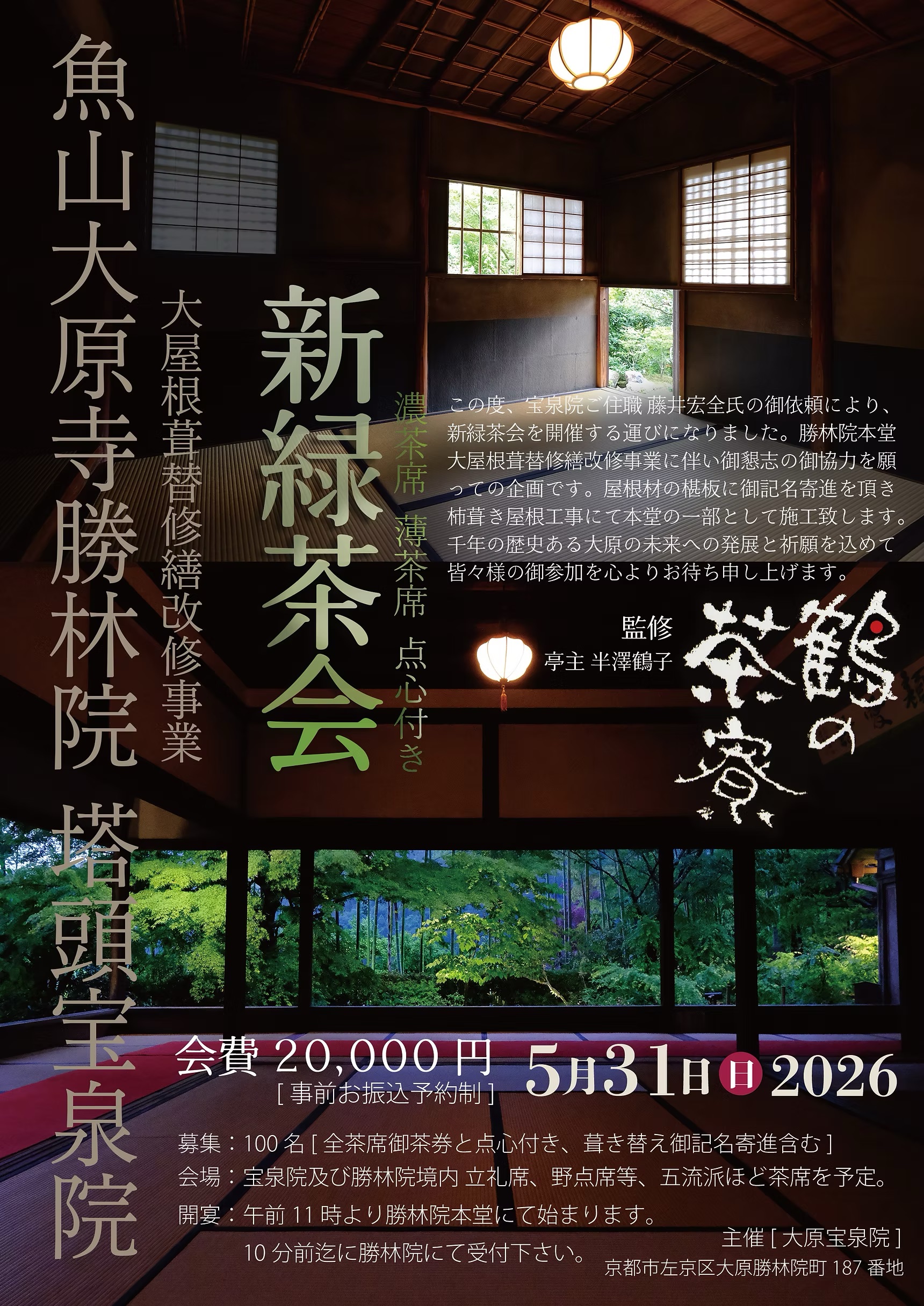 募集:100名[全茶席御茶券と点心付き、葺き替え御記名寄進含む]