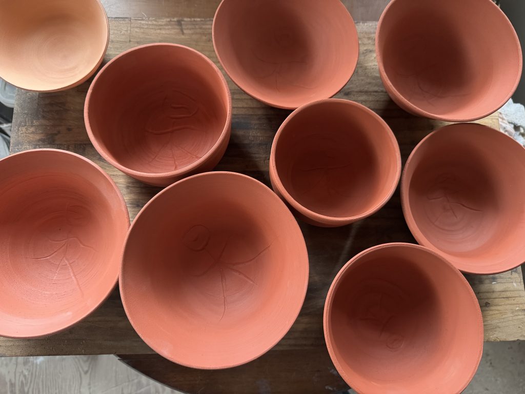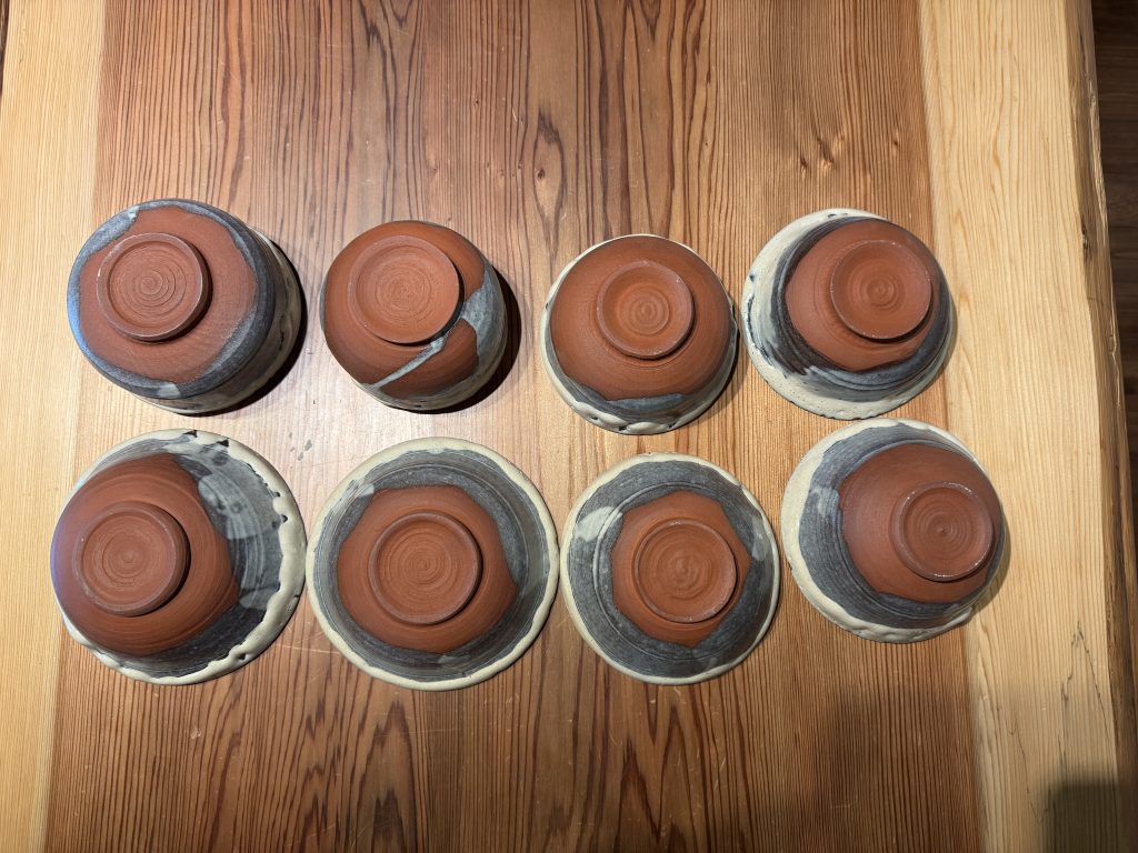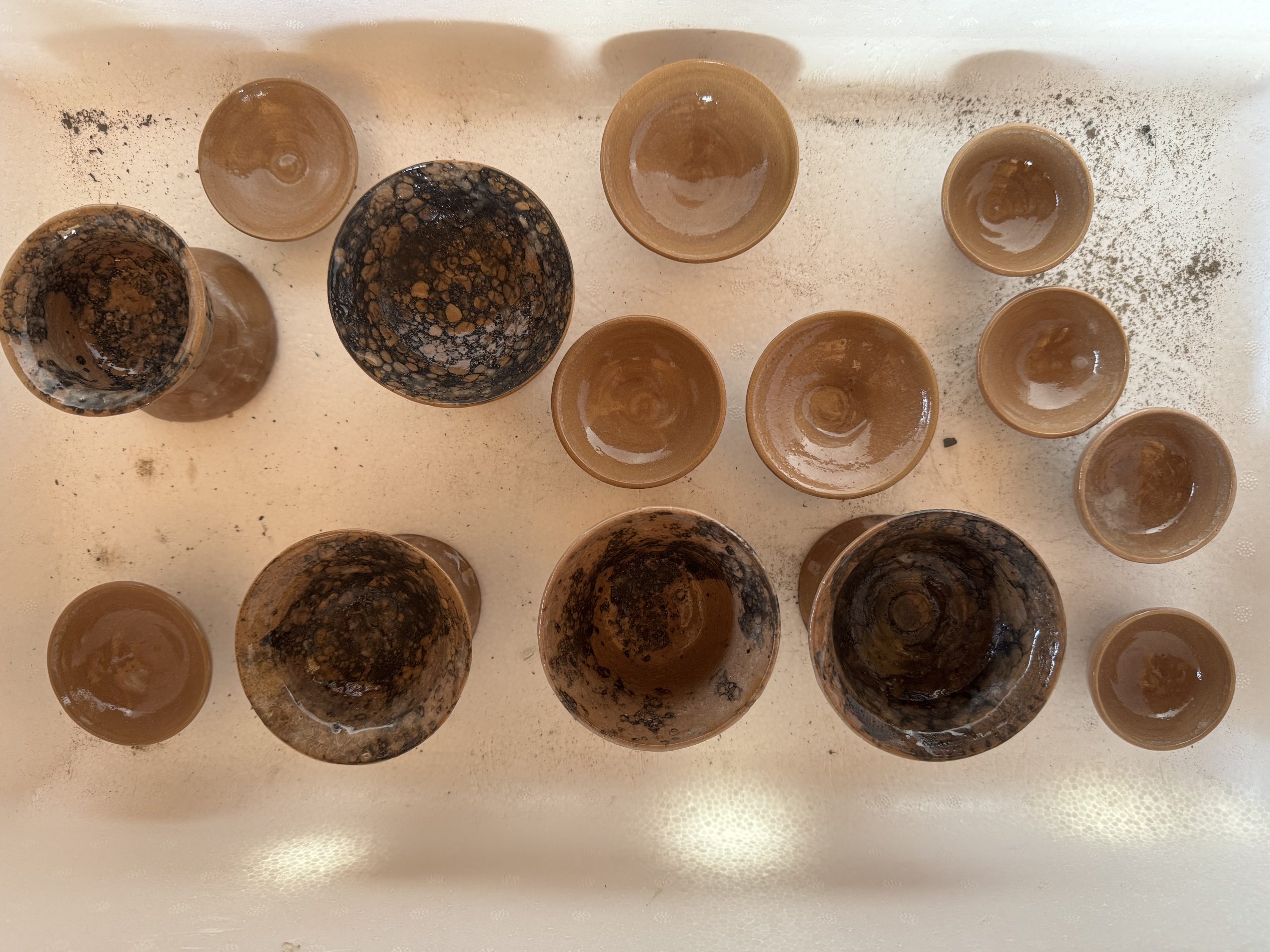 cuisson : four propane « raku » avec légère réduction à 950°. tentative de mettre des feuilles de bambou au fond des bols mais qui n’ont laissé aucune trace