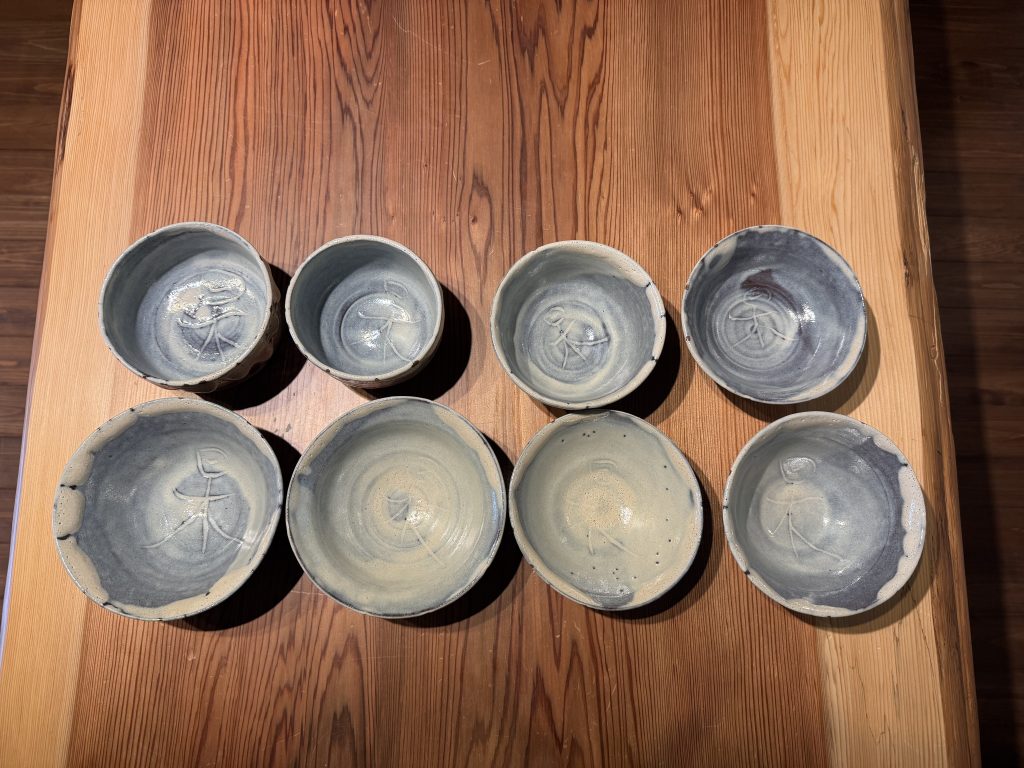 les deux bols avec dessins de souffleurs, le reste avec des calligraphies de 茶 (cha, thé) et 花 (hana, fleur) : pour être utilisé dans chabana sansô