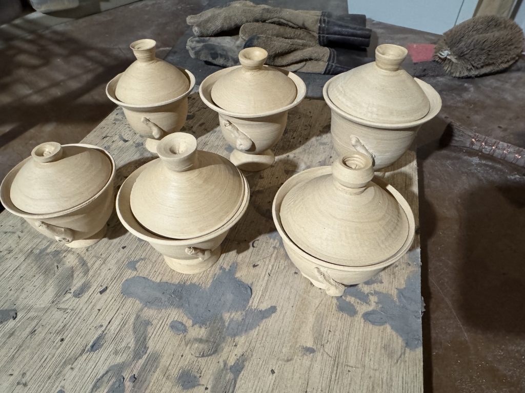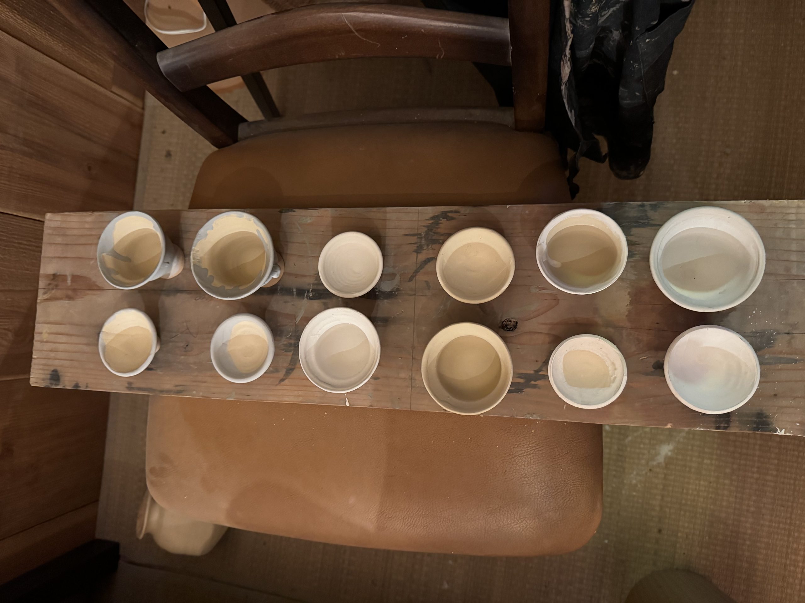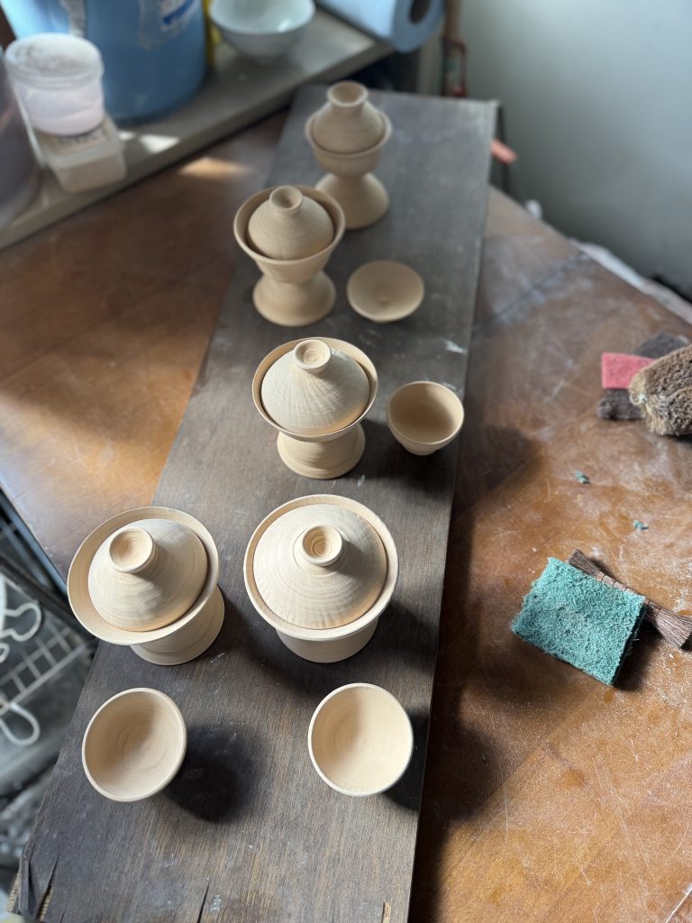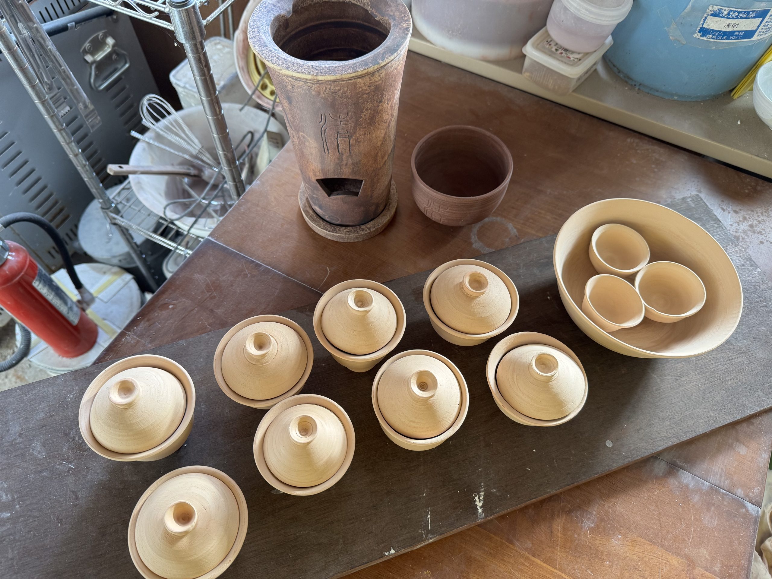 formes : egg shell cup, petit gaiwan, yunomi (je voulais les faire anguleux mais ils ont séché trop vite pendant la nuit)