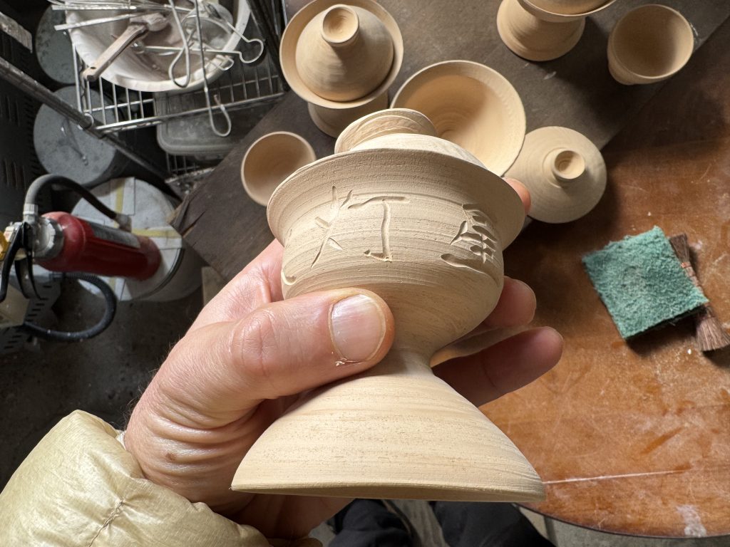 argile : han-jiki (mi-porcelaine) de maruni. leçon acquise de la précédente cuisson : pas de déformation donc des formes simples. pas de galetage. aucun souci à 1230 et transparent 1230 (sango). aucune prise de kanyutage à l’encre (pas de micro fissure à la sortie du four à 150)