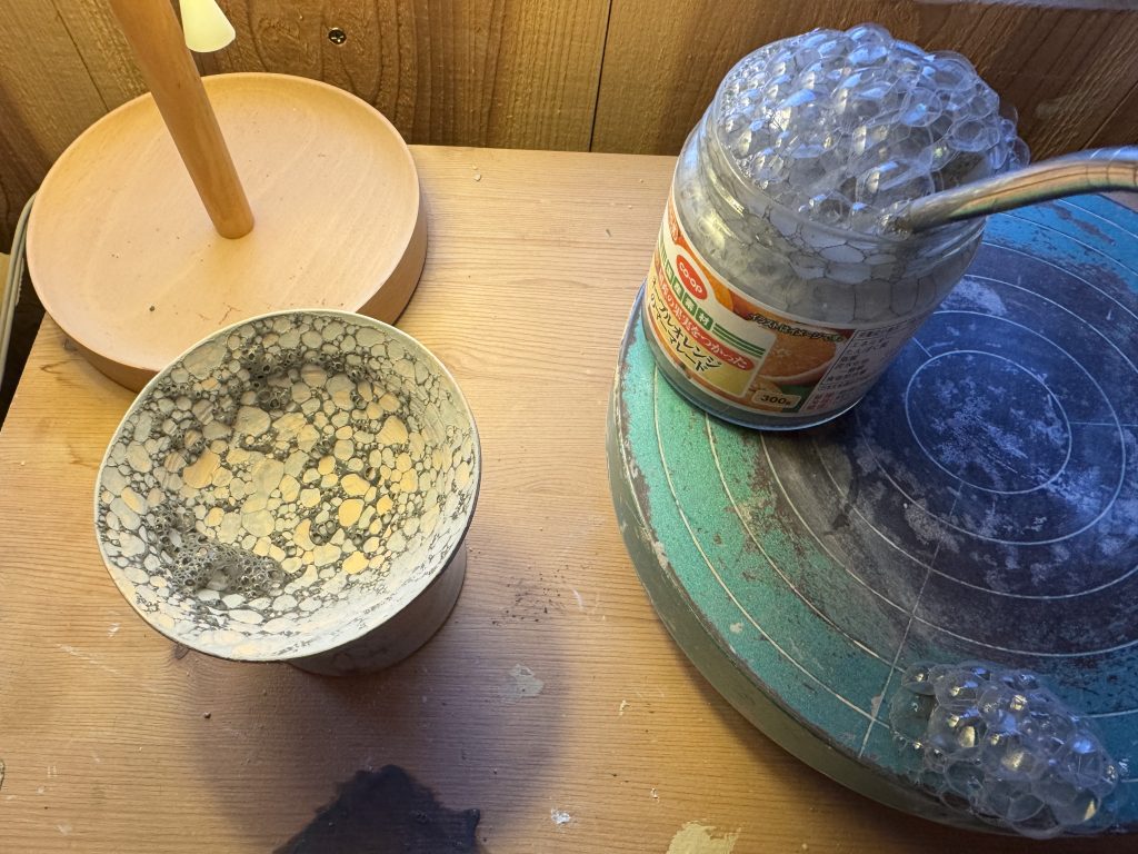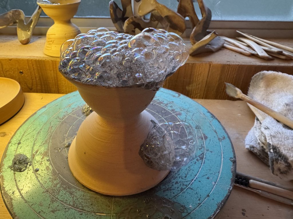 émail : youtube ne cessait de m’envoyer des vidéos de « bubble glazing » : à la troisième, je me suis lâchement soumis : liquide vaisselle et kuro-kesho (barbotine noire), bubblés à la bombilla ! et 12 Yシリーズ 白氷裂釉