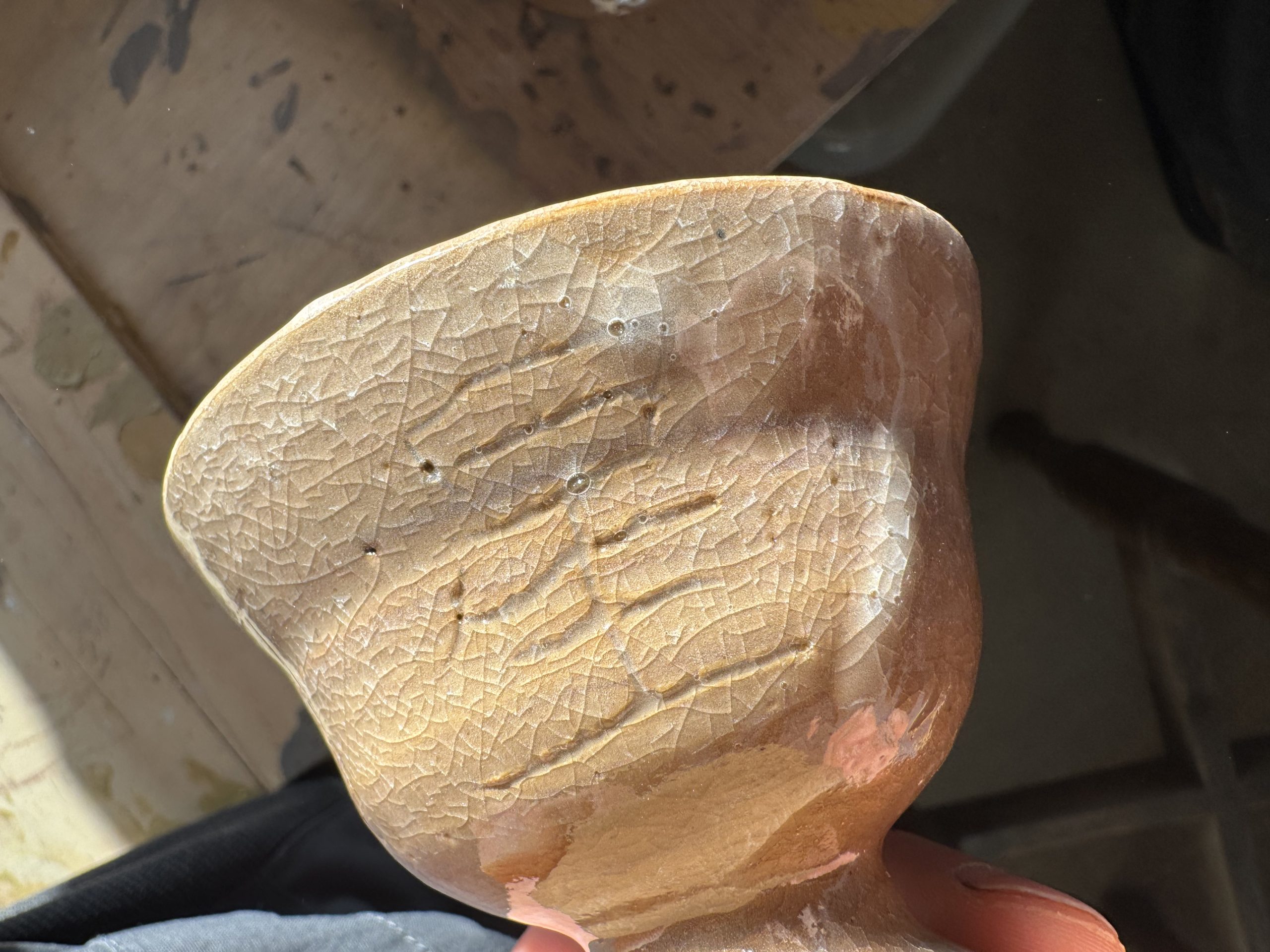 argile : rouge 59-1 特赤 (shigaraki) , trop sombre pour de l’émail soba shino, notamment trop dilué (effet brun / bizen plutôt que le blanc attendu)