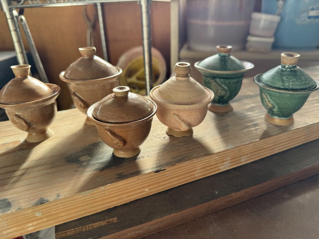 formes : petits gaiwan (la petite assiette sous le gaiwan permet aux grandes paluches de manier l’instrument sans se brûler). les pieds coupés des gaiwans seront utilisés comme pendants souvenirs.
