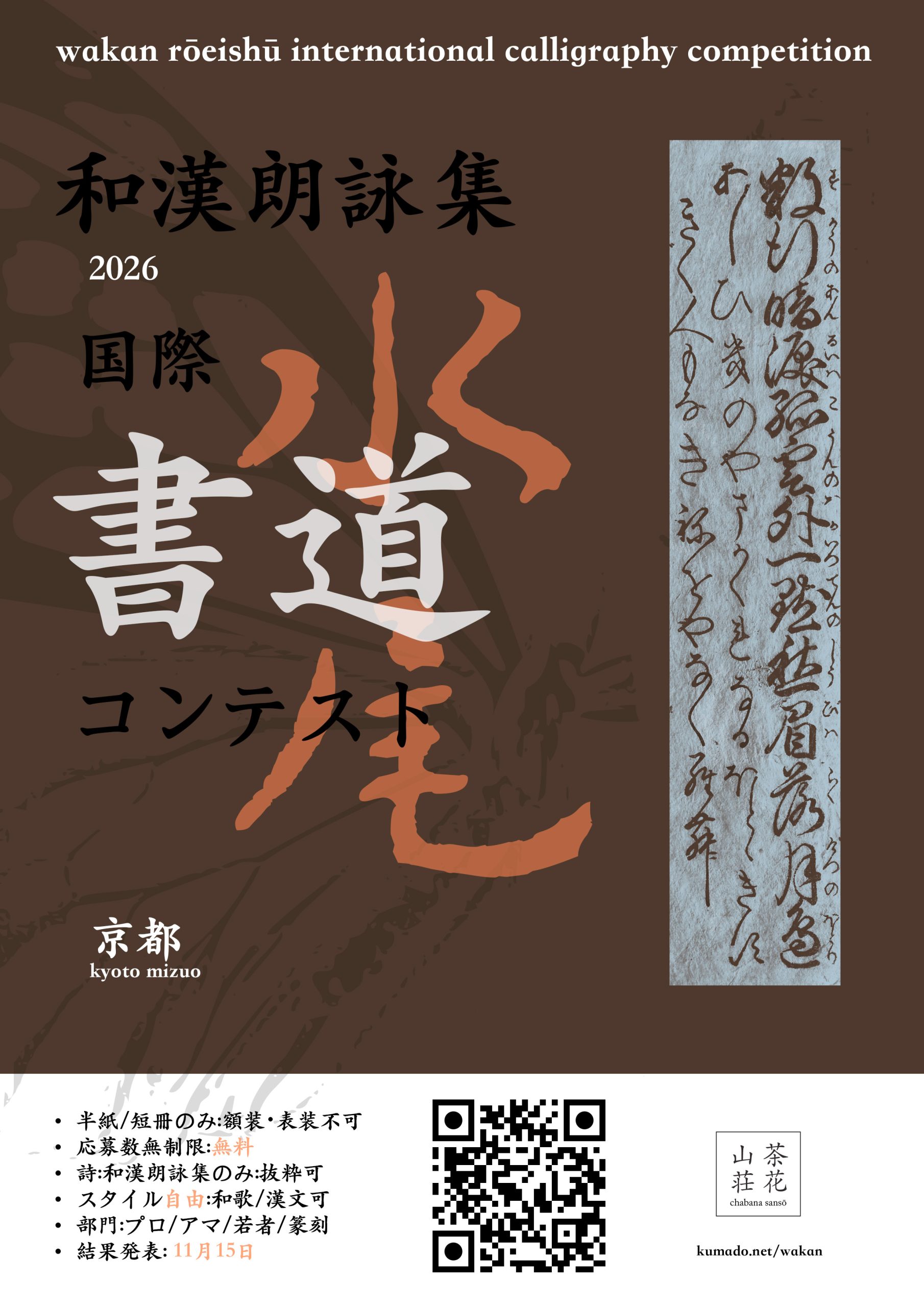半紙(24 × 33 cm)または短冊(6 × 36 cm)のみ、額装・表装は不可。 - 応募数: